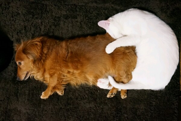 暖かいマットのスイッチを入れたら仲良く一緒に寝ていたのですが、気が付いたら犬のお尻に密着してオムツのようになっていました