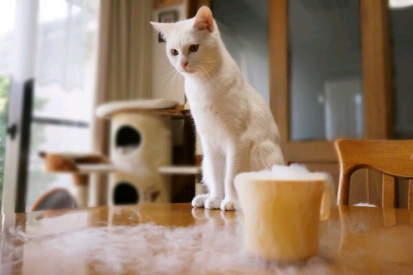 超ビビり屋さんのタマ、初めて見るドライアイスに首が伸びています 不思議な動きをするドライアイスにビビっていました