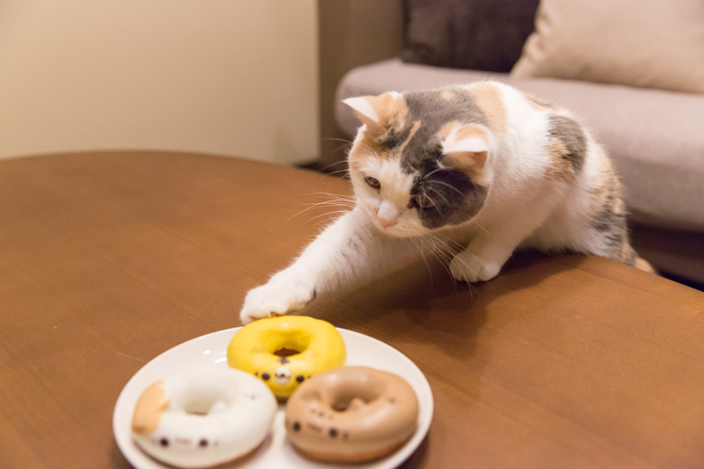 雪柳は好奇心旺盛なので、何でも手をのばします。ドーナツは食べられませんが…