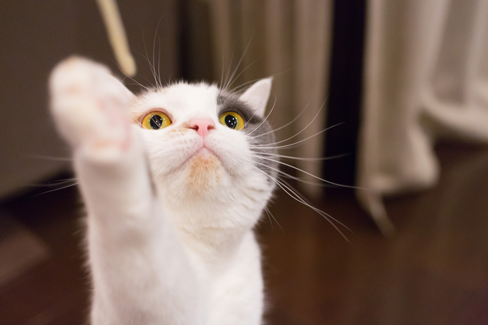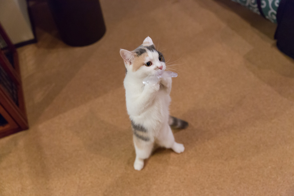 ヒモっぽいものは全てオモチャと認識されます。目つきが真剣です