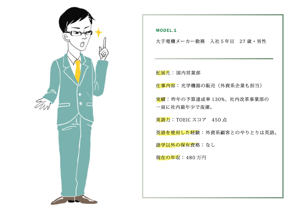 「この方は外資系企業向けに光学機器の販売をしていて、仕事の成績が非常にいい。なので、顧客リストには優良な外資系企業が並んでいるでしょう。そんな企業のクライアントと日頃から信頼関係を築いておけば、その企業に転職できる可能性があります。例えば、外国人の役職の方と英語で商談ができたりすると、「この人、できるな」と思われて、評価と信頼を得やすい。後々、「うちにきてくれない?」とひきぬきにあうかもしれません。そういうことは、実際よくある話です。お客さん側の外資系企業に転職をするチャンスが訪れたら現在のTOEIC®スコア450点を600点くらいに上げておくと、英語力の裏付けになるはずです」(小松さん・以下、同)