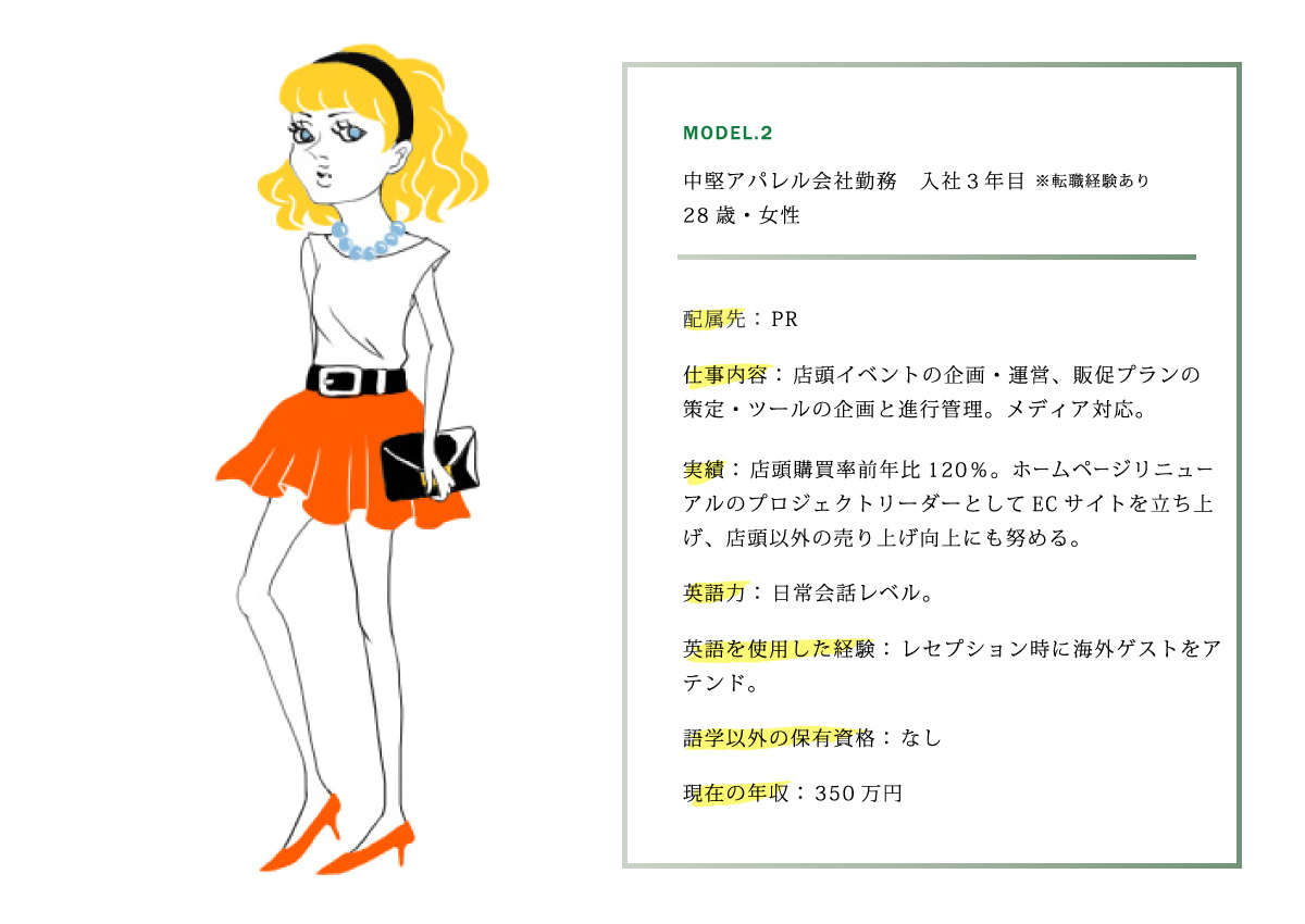 アパレル業界は若い人の感覚が大切にされる傾向があります。この方は28歳ですが、そろそろ若い感覚へのジレンマを感じはじめる時期ですよね。なので、ここから仕事のスケールを広げていかなければならない。そこで、今のキャリアに英語力をプラスすると、海外での仕入れや縫製工場の下見など、事業の深部を担う仕事を任される可能性が出てきますよ。
