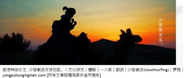 フェイスブックページ:世界を旅する女バックパッカー (沙發衝浪客。a Couchsurfer from Hong Kong)