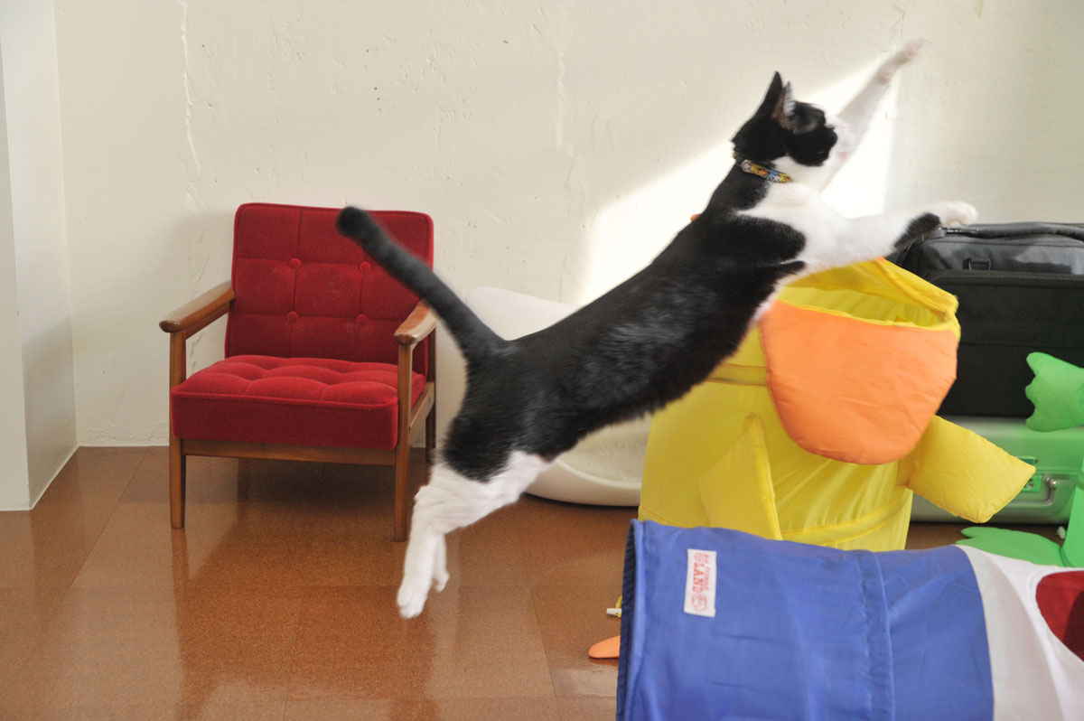 右側におもちゃのネズミが飛んでいるのを