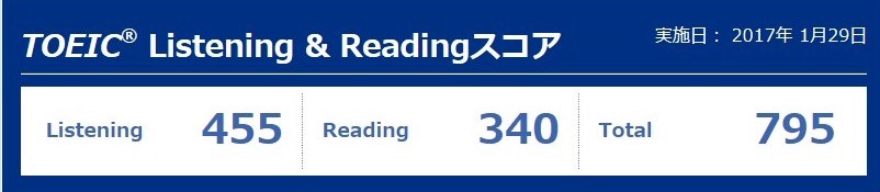 今回はリスニング455、リーディング340、合計795という結果でした。