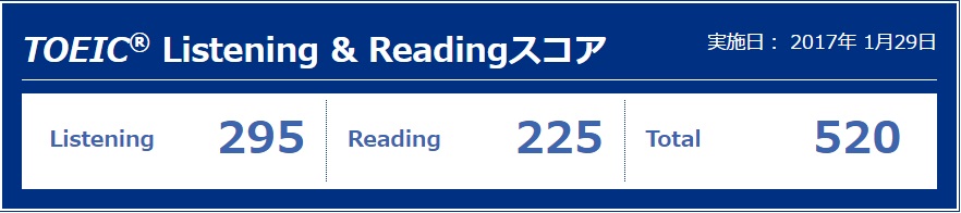 1月29日に受験したTOEICの結果はリスニング295点、リーディング225点の合計520点という結果でした。