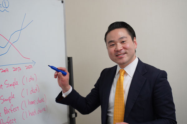 『Mメソッド』を用いたレッスンでは、論理的な説明は日本人バイリンガル講師、より自然な英語表現の指導はネイティブ講師が担い、両側面からの指導を行っています。レッスンの進め方として、受講者にとって初見であるIELTSの過去問題を事前に解いてからレッスンに挑んでいただいています。そしてレッスン中、間違ったところの文法、単語などを中心に解説指導し、目標スコアを達成していただいています」。
