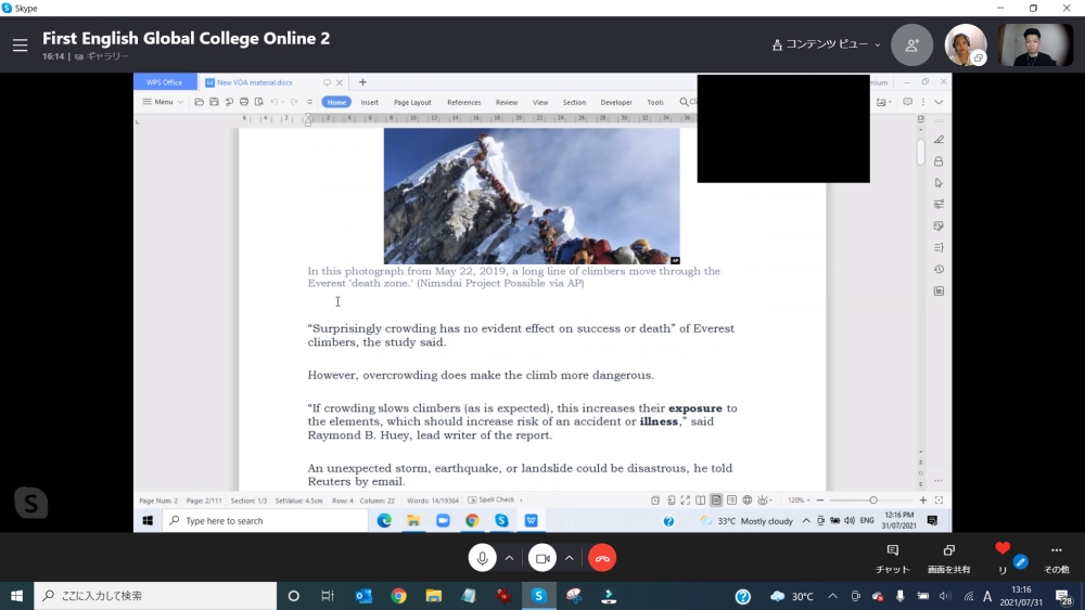 VOAクラスはアメリカ合衆国政府が運営する国営メディア、"Voice of America"が提供する"Learning English"のサイトの音源を使って、リスニングとスピーキングを行っていきます。 題材は先生が事前に選択してくれていて、今回使った題材は"Climbers Twice as Likely to Reach Top of Mount Everest than in Past"、エベレストに登頂する登山者が過去と比べて倍になっていることを説明した内容でした。