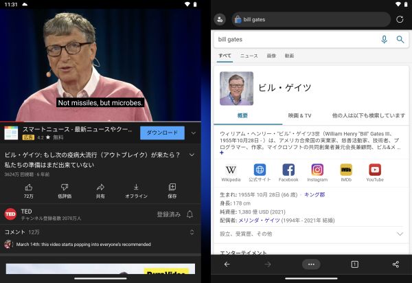 編集部が考える英語学習法その1は左側にYouTube、右側にWebを置く方法です。 YouTubeを見ながら、わからない単語が出てきたらWebや辞書アプリで検索します。 この例では、TEDでのビル・ゲイツの講演をサンプルにしています。