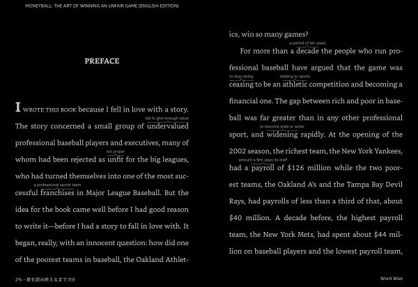 Kindleアプリでは、辞書機能、Wikipedia検索も内蔵しているので、読書に集中したい時はこのような見開きでの表示で邪魔が入らず良いと思われます。 またKindleはWordWiseという機能を持っているので、難しい単語の上部に解説を表示させることも出来ます。