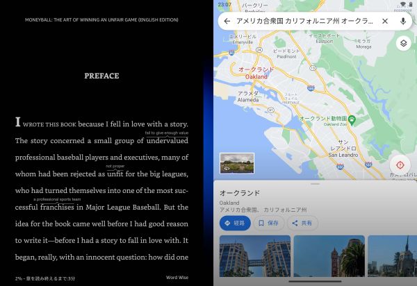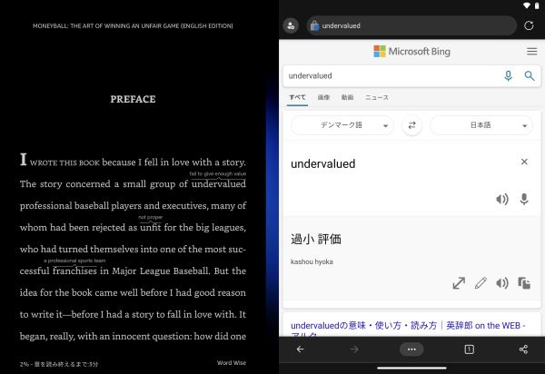 Kindleを左側に表示して、右側にブラウザや辞書アプリを表示します。