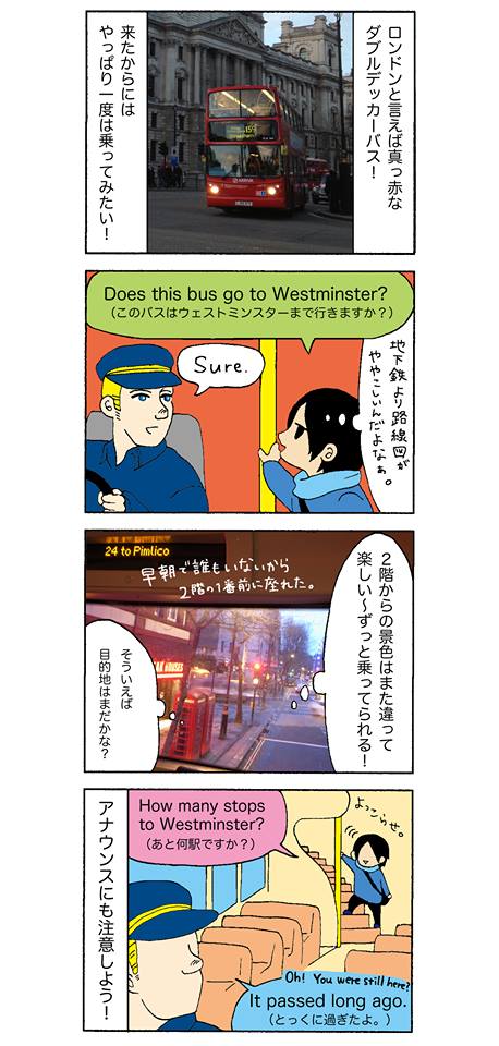 引き続き、あやまるの爆笑ロンドン珍道中を4コマ漫画でお届けすると共に、各シーン別のお役立ち英会話も解説していきます。この物語は帰国後あやまるの中で美化された部分があるかも(笑)